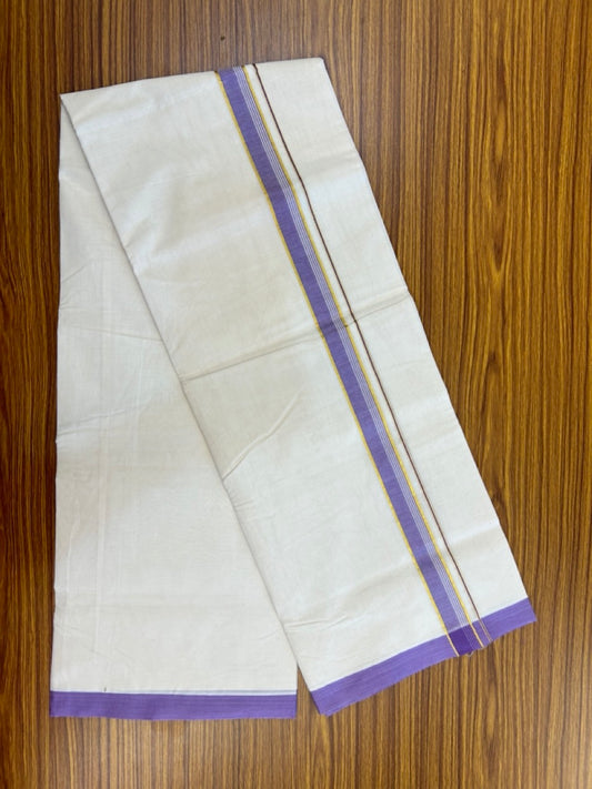 20% Discount !! KaithariKada Balaramapuram 100% Cotton Double Off white - (Unbleached) Mundu/Dhoti-100x100 - 1 inch Gold Kasav & Lavender Violet Striped Kara - 2 KK5274 ASH