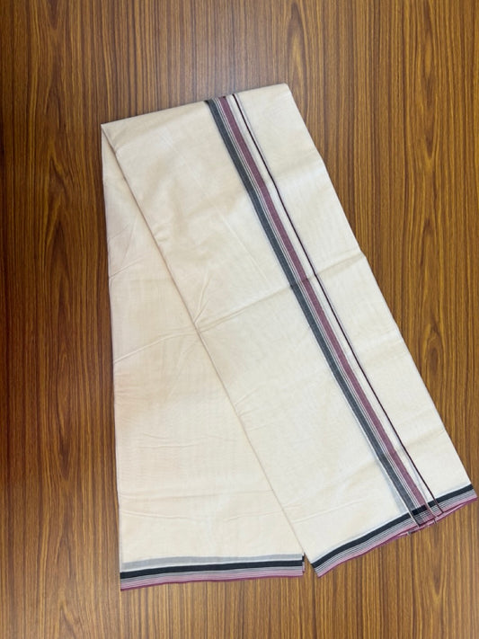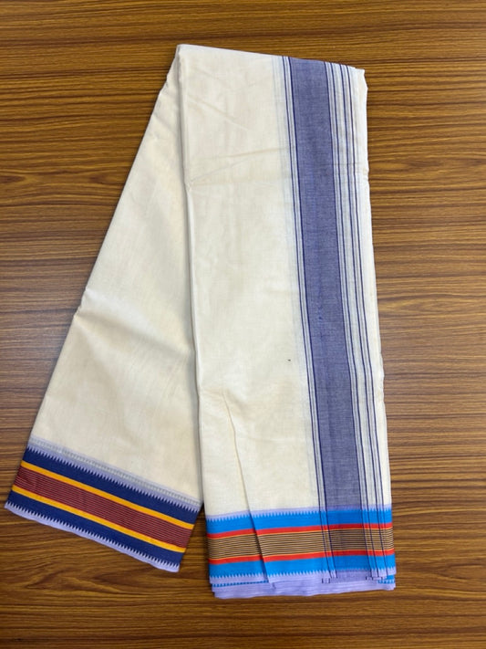 Panchakacham Dhoti - 37% Discount! Kaitharikada 100% Cotton Off White (Unbleached) - Pure Cotton - 100x100 thread - North Indian Attached Gamcha - 9X5 - Dhoti Violet kara with Multi colour Striped border - 1 KK5275 PMC