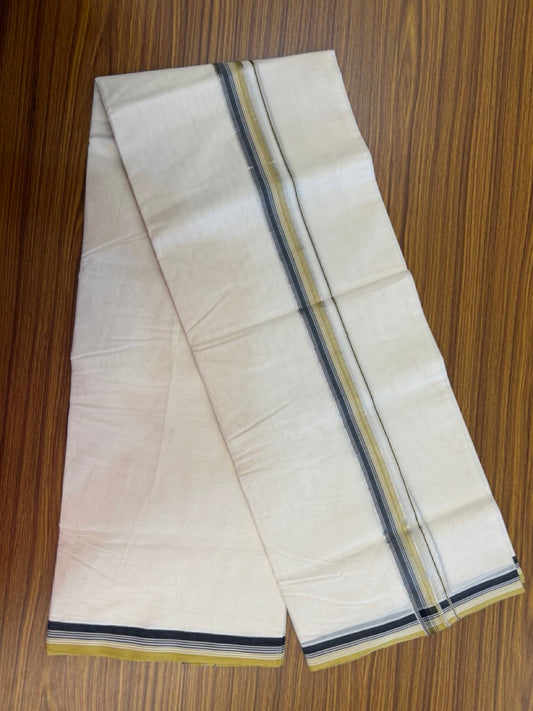 20% Discount !! KaithariKada Balaramapuram 100% Cotton Double Off white - (Unbleached) Mundu/Dhoti-100x100 -1.25 inch Silver Kasav Black & Mustard Yellow Center Striped Kara - 9 KK5274 ASH