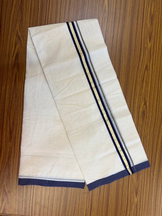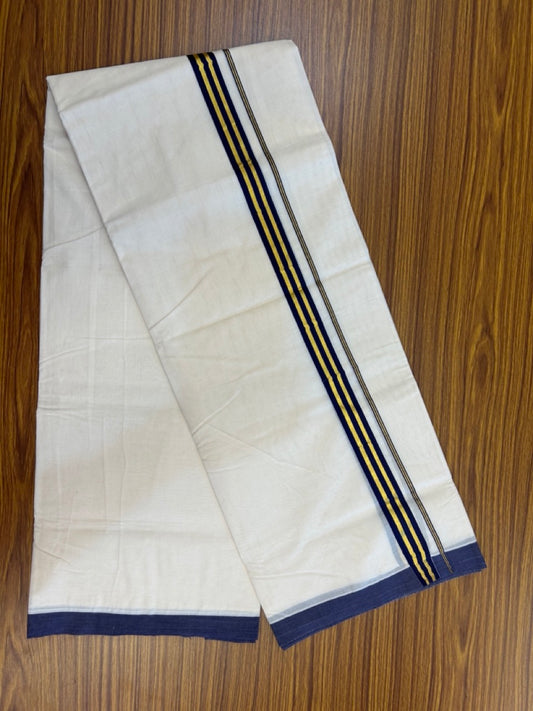 20% Discount !! KaithariKada Balaramapuram 100% Cotton Double Off white - (Unbleached) Mundu/Dhoti-100x100 - 1 inch Gold Kasav & Navy Blue Striped Kara - 4 KK5274 ASH