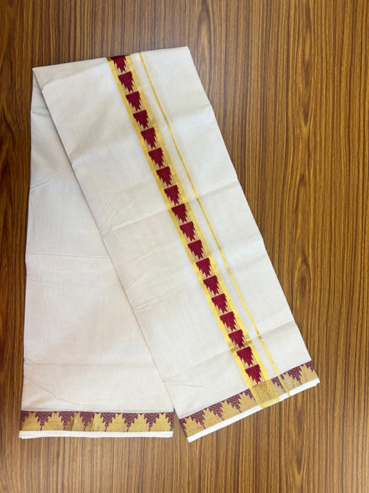 25% Discount ! KaithariKada Handloom Unakkupaav Balaramapuram - 100% Pure Cotton Off White - (Unbleached) Double Mundu/Dhoti - 100x80 - 1.5 inch Gold Kasav & Maroon Red Temple Jacquard Design Kara 4 mtr (8.5 Muzham) - 8 KK5272 ABH