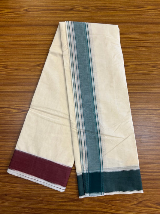 Panchakacham Dhoti - 37% Discount! Kaitharikada 100% Cotton Off White - (Unbleached) - Pure Cotton - 100x100 thread - North Indian - Attached Gamcha - 9X5 - Dhoti Green kara with Dark Green & Dark Brown Striped border - 3 KK5275 PMC