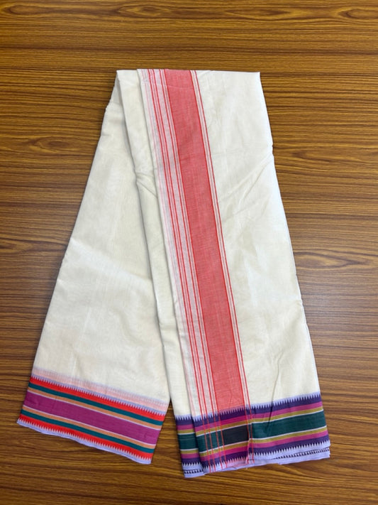 Panchakacham Dhoti - 37% Discount! Kaitharikada 100% Cotton Off White - (Unbleached) - Pure Cotton -100x100 thread - North Indian - Attached Gamcha - 9X5 - Dhoti Red Pink kara with Multi colour Striped border - 2 KK5275 PMC
