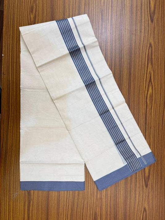 20% Discount! KaithariKada Balaramapuram 100% Cotton Off white Double Mundu/Dhoti - (100x80)S - 1.75 inch Steel Blue & Silver Kasav Striped Kara - 4mtr (8.5muzham) - 80 KK5255 VAS