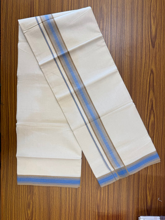 20% Discount! KaithariKada Balaramapuram 100% Cotton Off white Double Mundu/Dhoti - (100x80)S - 1.75 inch Blue & Sand Brown Shaded & Striped Kara - 4mtr (8.5muzham) - 98 KK5255 VAS