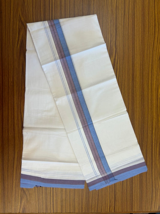 20% Discount ! Kaitharikada Balaramapuram 100% Cotton Pure White Double Mundu/Dothi - 100x80 - 1.5 inch Peacock Blue & Purple Brown Shaded Striped Kara 4 mtr (8.5 muzham) - 50 KK5255 VAS