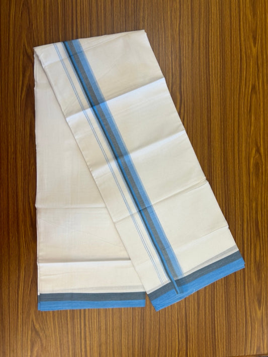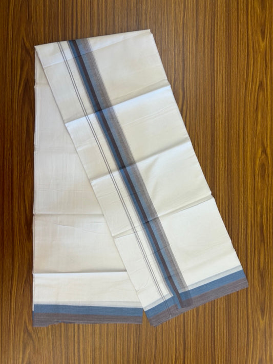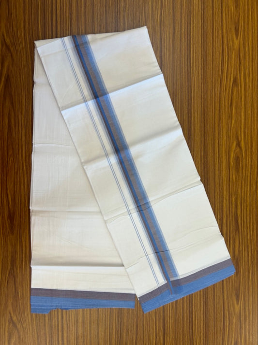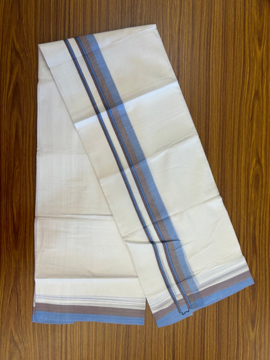 20% Discount ! Kaitharikada Balaramapuram 100% Cotton Pure White Double Mundu/Dothi - 100x80 - 1.5 inch Blue & Light Brown Shaded Striped Kara 4 mtr (8.5 muzham) - 52 KK5255 VAS