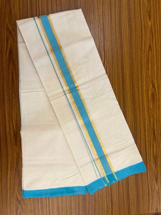 25% Discount! KaithariKada Handloom Millpaav Balaramapuram - Cotton Double Mundu/Dhoti Off white (Unbleached) - 80x90 - 1.5 inch Kasav & Turquoise blue Kara 3.60 meter (8 Muzham) - 60 KK5256 RAM