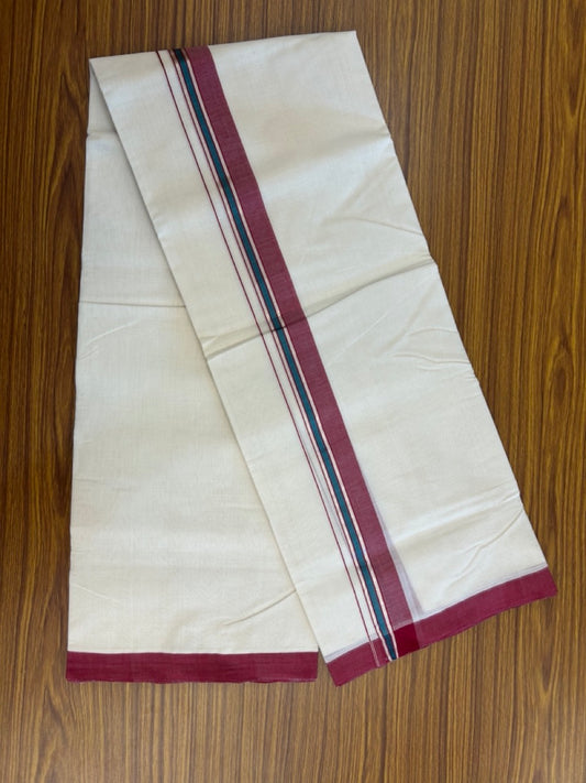 25% Discount ! KaithariKada Handloom Millpaav Balaramapuram - 100% Pure Cotton Off White (Unbleached) Double Mundu/Dhoti - 80x90 - 1.5 inch Silver Kasav Maroon & Peacock Blue Striped Kara 4 Meters (8.5 Muzham) - 21 KK5256 RAM