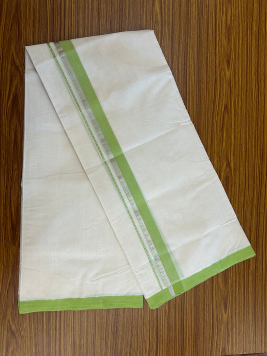 25% Discount! KaithariKada Handloom Millpaav Balaramapuram - 100% Pure Cotton Off White (Unbleached) Double Mundu/Dothi - 80x90 - 1.5 inch Silver Kasavu stripes Light Green Mulloth Kara 4.5 Meters (10 Muzham) - 27 KK5256 RAM