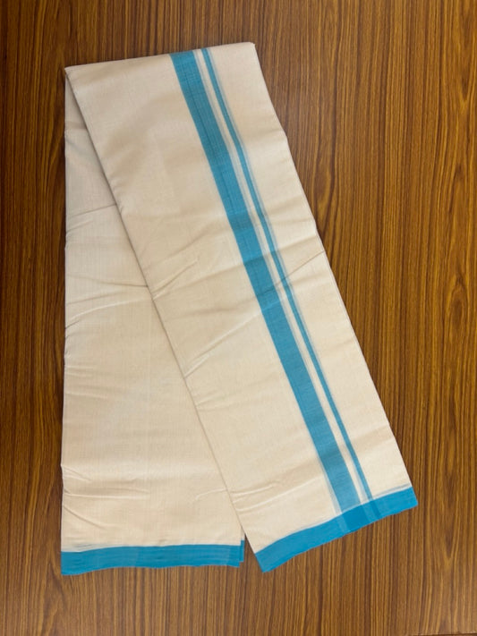 25% Discount! KaithariKada Handloom Millpaav Balaramapuram - Cotton Double Mundu/Dhoti Off white (Unbleached) - 80x90 - 1.25 inch Turquoise Blue Mulloth Kara 3.60 meter (8 Muzham) - 41 KK5256 RAM