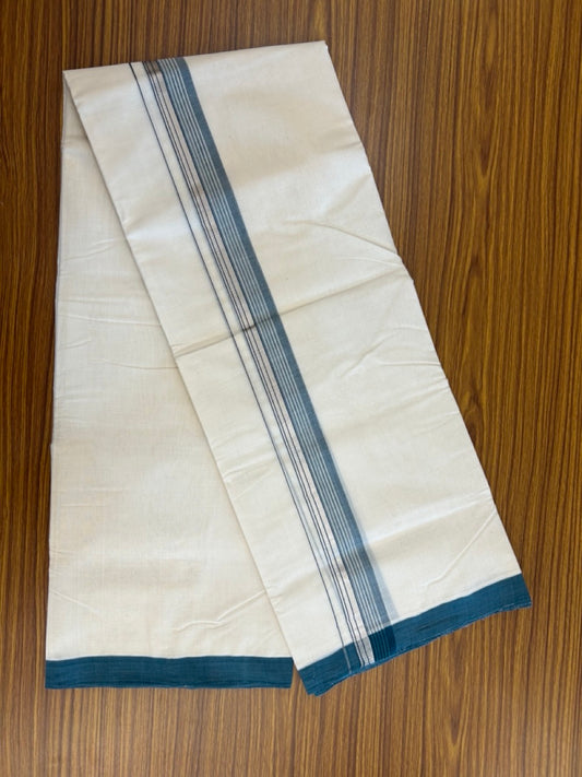 25% Discount ! KaithariKada Handloom Millpaav Balaramapuram - 100% Pure Cotton Off White (Unbleached) Double Mundu/Dhoti - 80x90 - 1.5 inch Silver Kasav & Peacock Blue Striped Kara 4 Meters (8.5 Muzham) - 17 KK5256 RAM