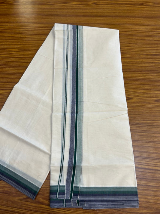 20% Discount! KaithariKada Balaramapuram 100% Cotton Double Off White (unbleached) Mundu/Dhoti- 100x80- 1.5 inch Silver Kasav Green & Navy Shaded striped Kara 4 mtr (8.5 muzham) - 62 KK5251 PMC