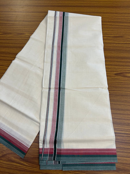 20% Discount! KaithariKada Balaramapuram 100% Cotton Double Off White (unbleached) Mundu/Dhoti- 100x80- 1.5 inch Silver Kasav Green & Maroon Shaded striped Kara 4 mtr (8.5 muzham) - 64 KK5251 PMC