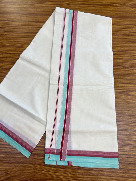 20% Discount! KaithariKada Balaramapuram 100% Cotton Double Off White (unbleached) Mundu/Dhoti- 100x80- 1.5 inch Silver Kasav Maroon & Mint Green Shaded striped Kara 4 mtr (8.5 muzham) - 63 KK5251 PMC