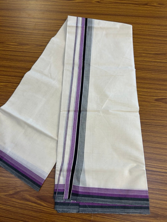20% Discount! KaithariKada Balaramapuram 100% Cotton Double Off White (unbleached) Mundu/Dhoti- 100x80- 1.5 inch Silver Kasav Black & Violet Shaded striped Kara 4 mtr (8.5 muzham) - 65 KK5251 PMC