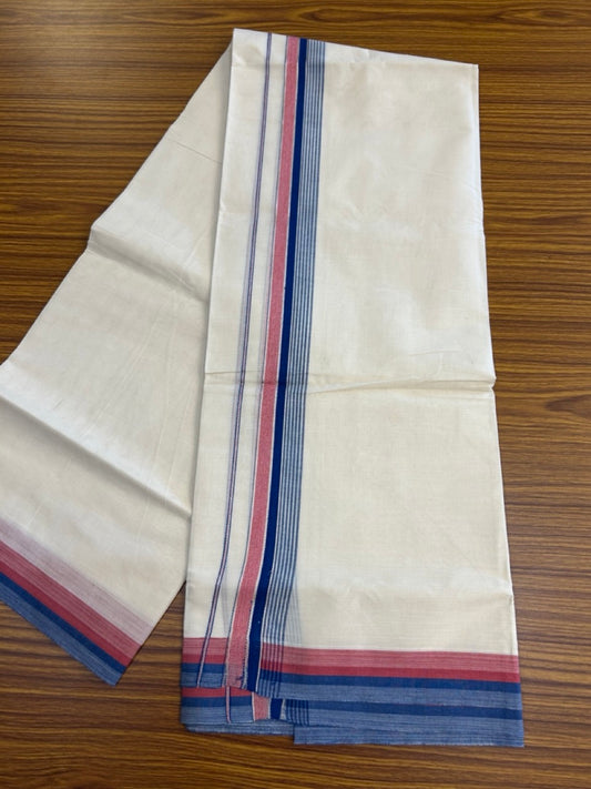 20% Discount! KaithariKada Balaramapuram 100% Cotton Double Off White (unbleached) Mundu/Dhoti- 100x80- 1.5 inch Silver Kasavu Blue & Red Shaded striped Kara 4 mtr (8.5 muzham) - 66 KK5251 PMC