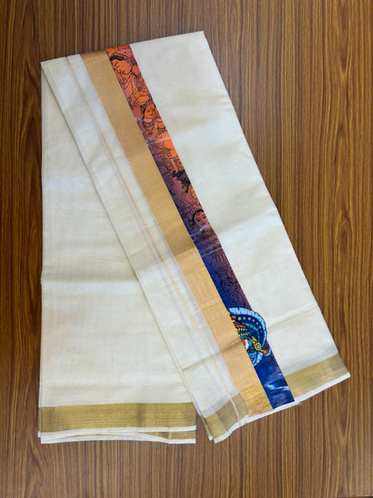 20% Discount! KaithariKada Balaramapuram off white Double - (Unbleached) Mundu/Dhoti - Mixed Cotton (80x72) - Hand Printed Kathakali, Radha Krishna Gold Kasav Blue & Orange Pattern 2.75 inch Kara - 89 KK5251 PMC