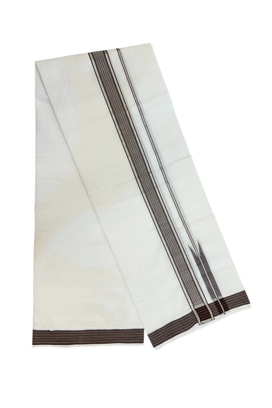 25% Discount!! New Ultra Pure White Handloom Balaram apuram - 100% Mercerised Cotton Double Mundu/Dhoti - 120 twisted warp x 80s weft - 1.5 inch Puliyilakkara Silver Kasav & Dark Brown Striped Chutty Kara - 2KK5232 REA