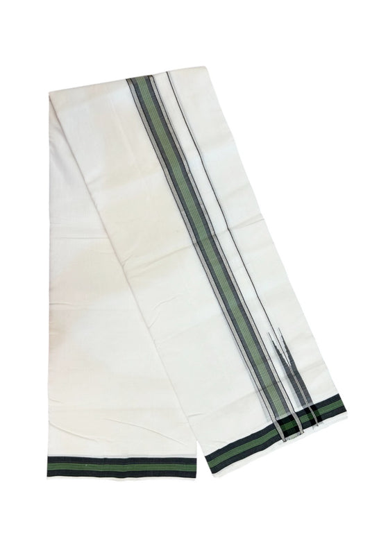 25% Discount!! New Ultra Pure White Handloom Balaram apuram - 100% Mercerised Cotton Double Mundu/Dhoti - 120 twisted warp x 80s weft - 1.5 inch Puliyilakkara Silver Kasav Black & Green Striped Chutty Kara - 3KK5232 REA