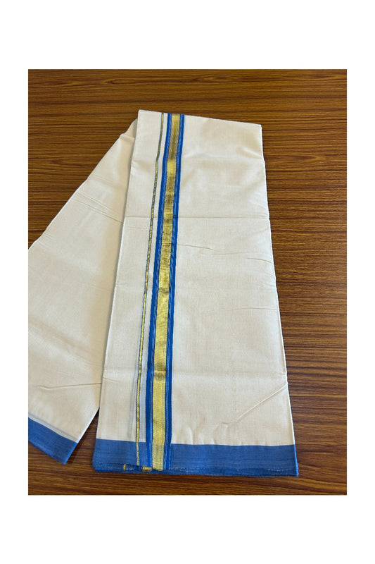 16% Discount!! KaithariKada Handloom Millpaav Balaramapuram - 100% Pure Cotton Off White - (Unbleached) Double Mundu/Dothi - 1.5cm Puliyilakkara side striped Gold kasav Blue chutty 3.80 mtr (8 Muzham) - 20KK498KK