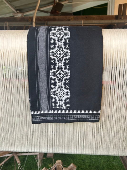 23% Discount!! Kaitharikada 90% cotton 5 % Polyster - Single Kaily / Lungi - 4.75 inch White printed kuppadam kara with Black colour body - 6KK496AST