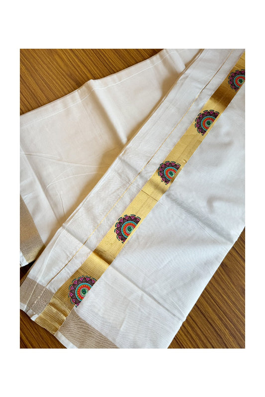 20% Discount !! KaithariKada Balaramapuram 100% Cotton Double Off white - (Unbleached) Mundu/Dhoti-80x72- Hand Painted Kasav & Flower Design - 15KK207PMC