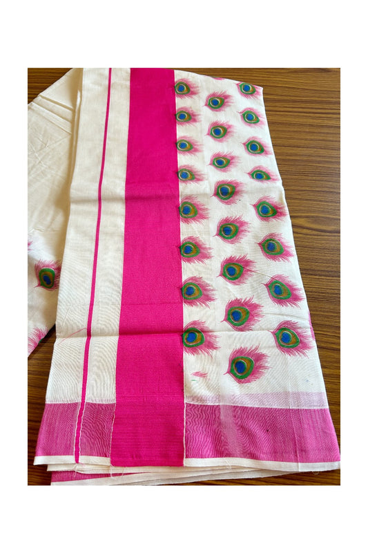 25% Discount! Kaitharikada Kerala Saree - Cotton Off white - Pink Kasavu with Peacock Prints- 16KK300VIN