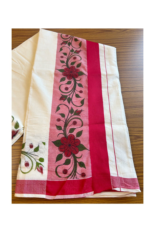 25% Discount! Kaitharikada Kerala Saree - Cotton Off white - Pink + red Kara with Floral Prints-21KK300VIN