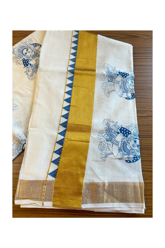 25% Discount! Kaitharikada Kerala Saree - Cotton Off white - Gold Kasavu Zari with Blue Krishna Printed - 23KK300VIN