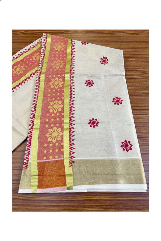 25% Discount! Kaitharikada Kerala Saree - Kasavu Tissue - Kasavu Zari & Floral Prints in Red & Gold- 4KK300VIN