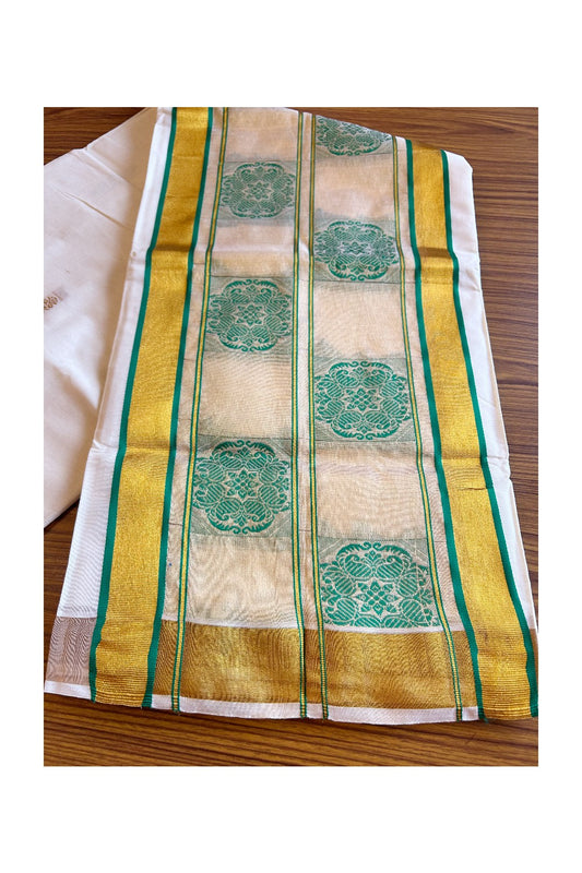 25% Discount! Kaitharikada Kerala Saree - Cotton Off white - 12 inch Kasavu Zari with Green Paisley Embroidery-9KK300VIN