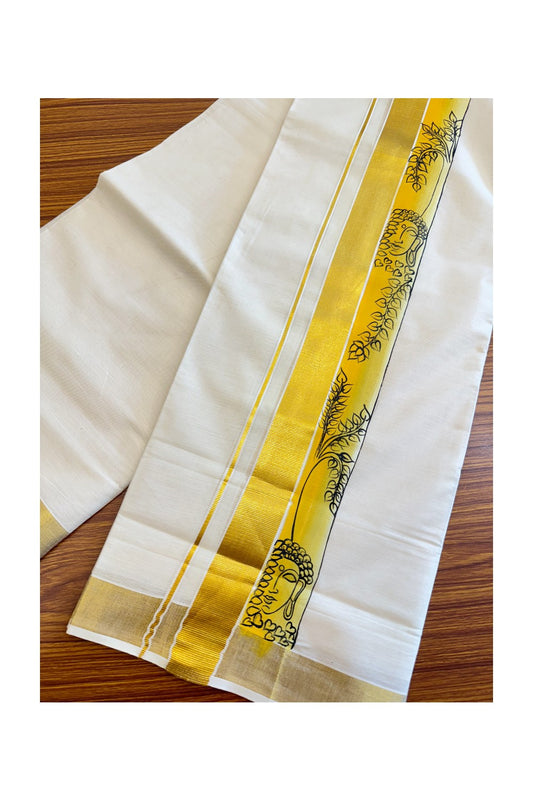 4% Discount!! KaithariKada Balaramapuram 100% Cotton Double Off white - (Unbleached) Mundu/Dhoti-80x72- 3.75 inch Kasavu Hand Painted Yellow Shaded Flower & Budha design-11