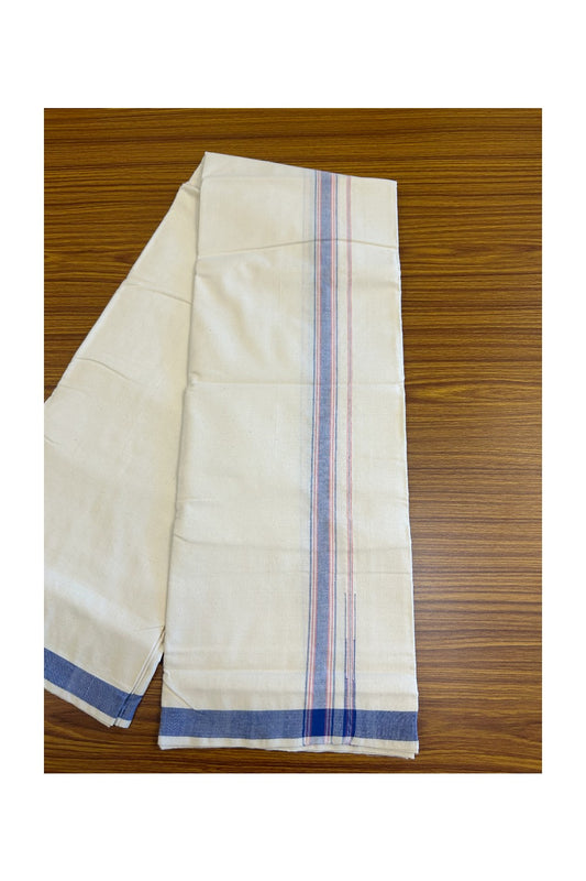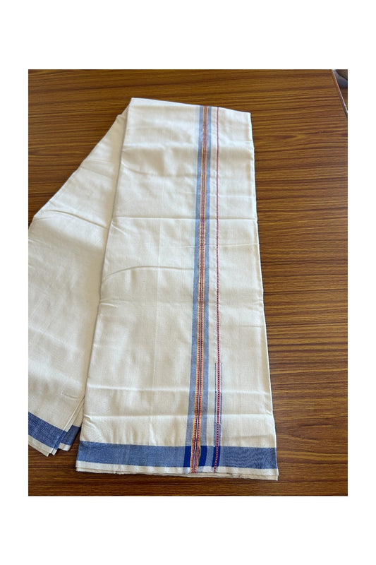 25% Discount ! KaithariKada 100% Cotton Balaramapuram Handloom Single Mundu/Dhoti - Off White (Unbleached) 1.Inch (2 meter / 4 muzham) Blue & Red Stripes Kasavu Puliyilakkara Chutty.