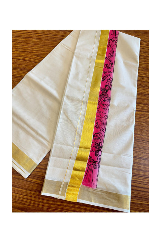 4% Discount!! KaithariKada Balaramapuram 100% Cotton Double Off white - (Unbleached) Mundu/Dhoti-80x72- 3.5 inch Kasavu Hand Painted Dark Pink Shaded Flower & Radha design-8