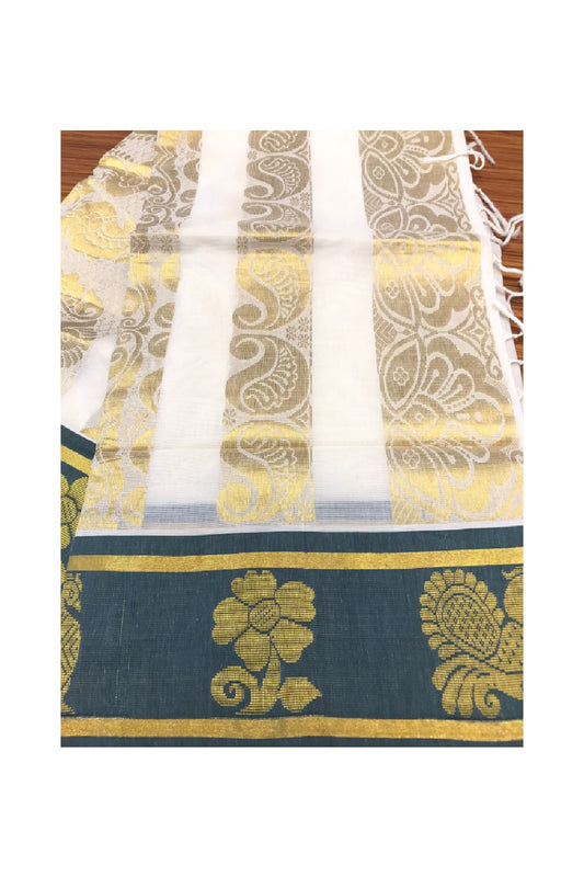 15% Discount KaithariKada Balaramapuram 100% Cotton Double Off white - (Unbleached) - Mundu/Dhoti- 100x100 - 1.75 inch Dark Green Kara - 7