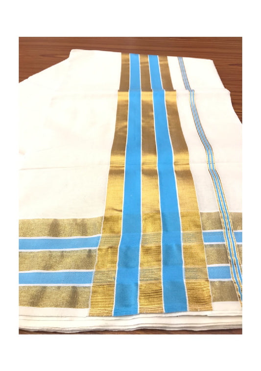 20% Discount Kaitharikada Kerala Saree - Cotton Kasavu Saree Pallu - Sky Blue & Kasavu Stripes .- 38.