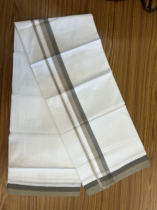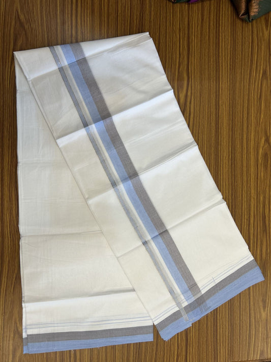 20% Discount! KaithariKada Balaramapuram 100% Cotton Double Pure white Mundu/Dhoti - 100X80 - 1.25 inch Silver Kasav Navy Blue & Light Sand Brown shaded kara - 4 mtr ( 8.5 muzham) - 86 KK5341 VIN