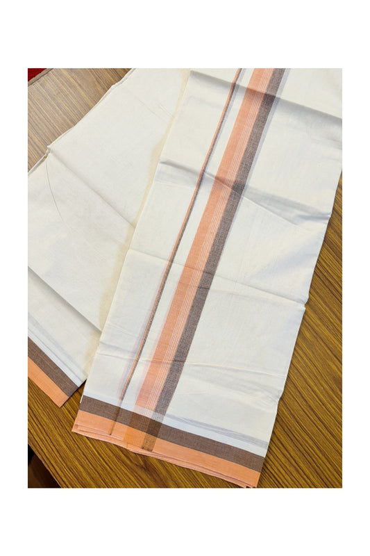 19% DISCOUNT ! KaithariKada Balaramapuram 100% Cotton Double off white - (Unbleached) Mundu/Dhoti - 100X100 Peach orange & brown shaded kara with centre stripes - 18KK81VIN