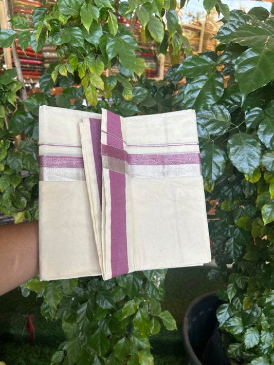 20% Discount ! Kaitharikada Balaramapuram 100% Cotton Off White Double Mundu/Dothi - 100x80- 1.5 Inch Silver Kasav & Rose Pink Kasav Striped Kara - 4mtr (8.5muzham)- 4 KK5279 CKS