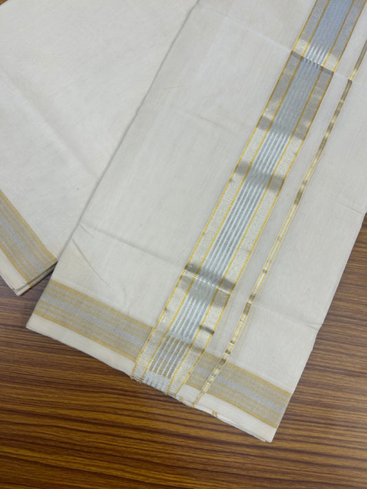 25% DISCOUNT!! KaithariKada Handloom Millpaav Balaramapuram - 100% Pure Cotton OFF White (Unbleached) Double Mundu/Dothi - 80x90 - 2 inch Silver & Gold Kasav striped Kara 4 Meters (8.5 Muzham) - 5 KK5264 RAM