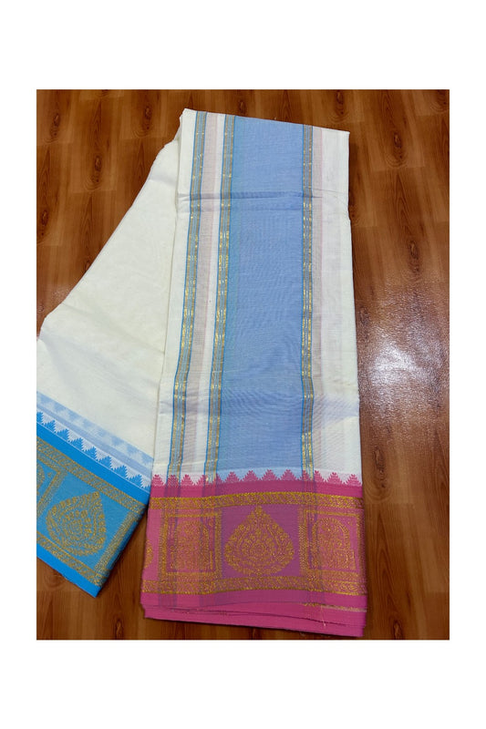 36% DISCOUNT! KaithariKada Cotton mix Off White - (Unbleached) 80x80 thread - 80 % Cotton & 20 % Polyester -NORTH INDIAN - ATTACHED GAMCHA 9X5 Dhoti 6 inch Blue kara with Pink Blue Kasavu Design border - 2KK5005PMC