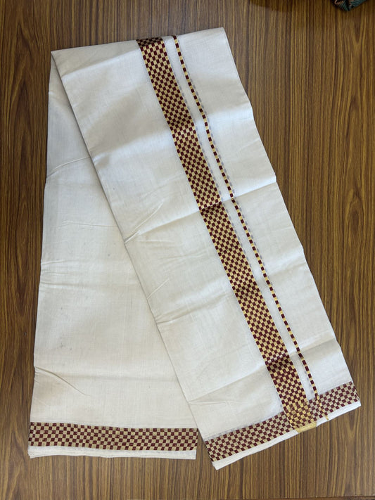 25% Discount ! KaithariKada Handloom Unakkupaav Kerala Handloom - Pure Cotton Off White - (Unbleached) Double Mundu/Dhoti - (100X80) - 1.5 inch Gold Kasav & Dark Maroon Jacquard Design Kara - 4 mtr (8.5 Muzham)- 21 KK5342 ABH
