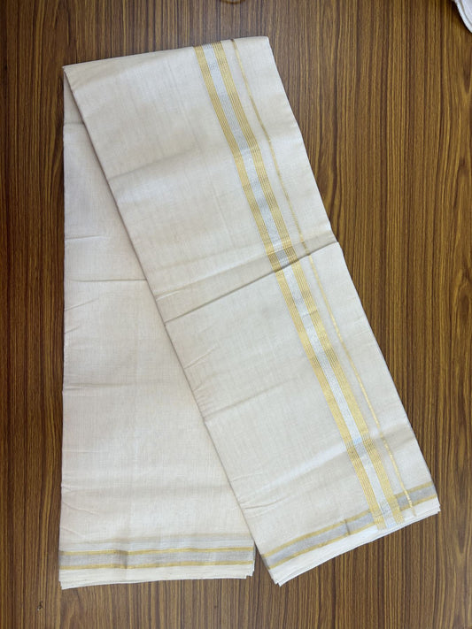 25% Discount ! KaithariKada Handloom Millpaav - Kerala Handloom - 100% Pure Cotton Off White (Unbleached) Double Mundu/Dhoti - 80x90 - 1.5 inch Gold Kasav & Silver Kasav striped Kara 4 mtr (8.5 Muzham) - 26 KK5337 RAM