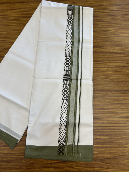 20% Discount ! KaithariKada Balaramapuram Cotton Double Pure white Mundu/Dhoti- 80s - 2.5 inch Olive Green Printed Shade Stripes Design Kara - 3.65 mtr (8 muzham) - 47 KK5329 GAN