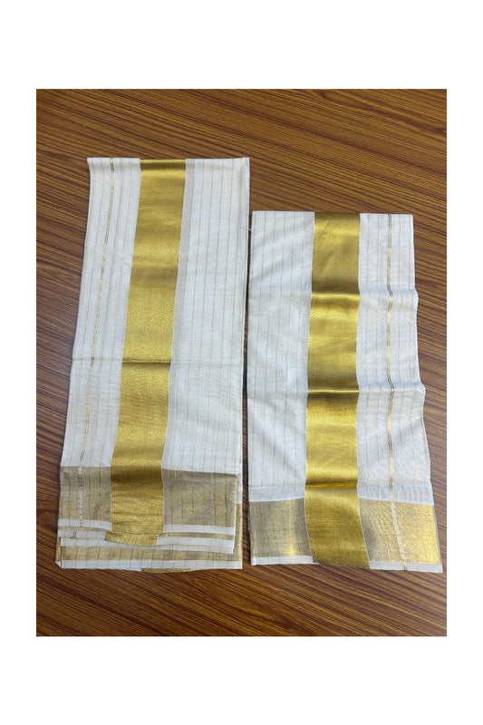 25% Discount!! KaithariKada - Kerala Pure Cotton OFF WHITE SINGLE SET MUND FOR WOMEN - Stripes Gold Kasavu Big Kara - 7KK5152PMC