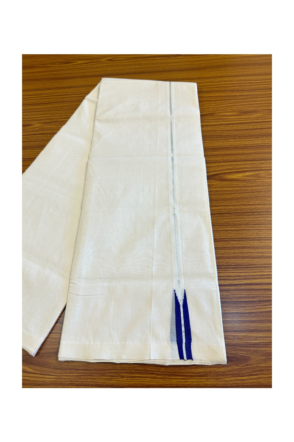 25% Discount!! KaithariKada Handloom Unakkupaav Balaramapuram - 100% Pure Cotton Off White - (Unbleached) Double Mundu/Dothi - 1.5 cm silver kasav Blue puliyilakkara chutty - 9KK476RAM