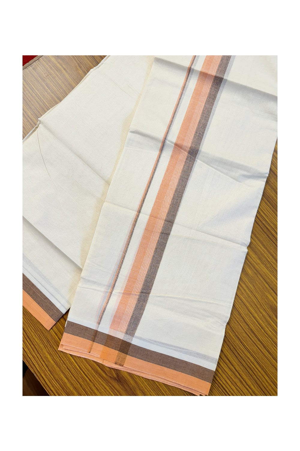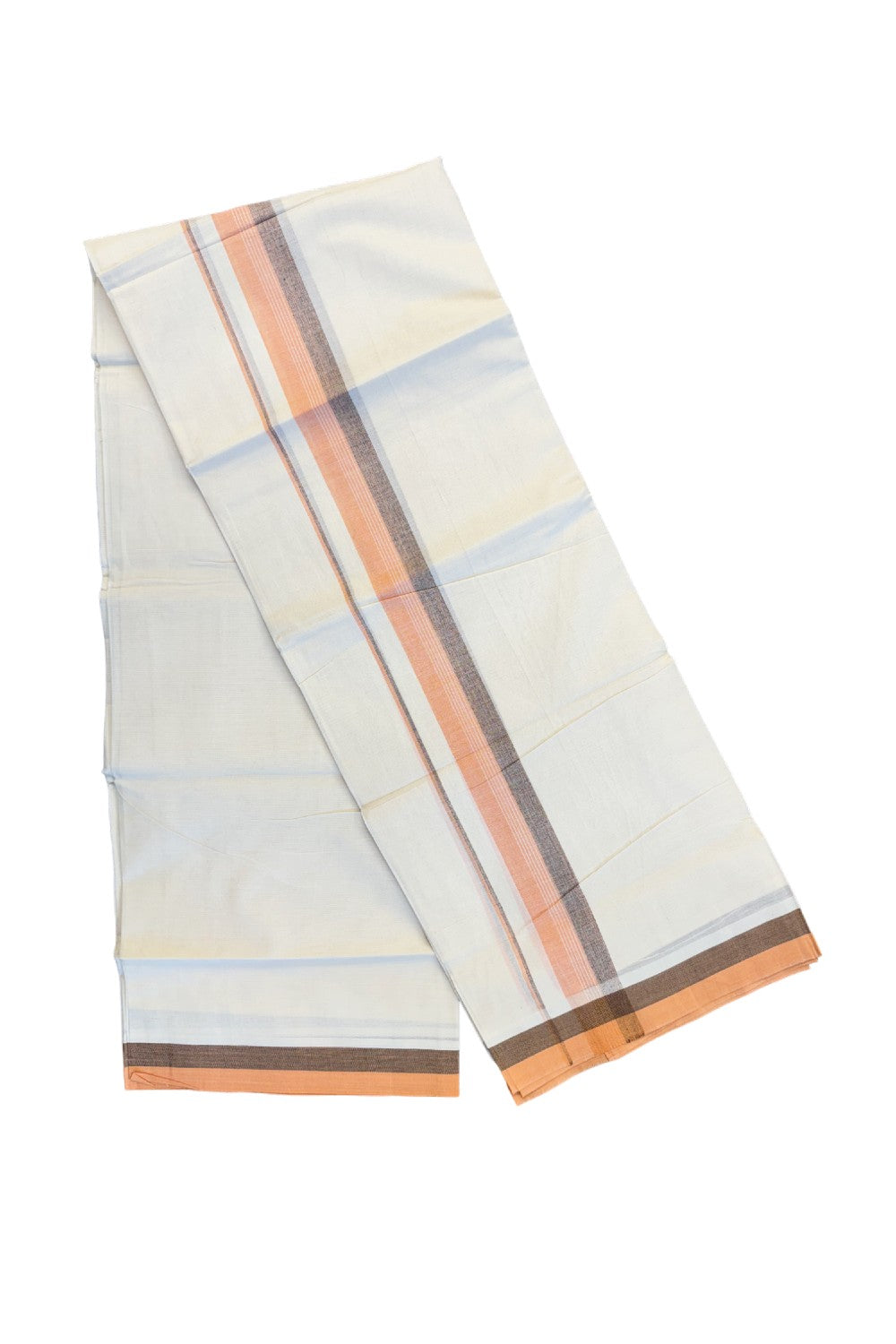 19% DISCOUNT ! KaithariKada Balaramapuram 100% Cotton Double off white- (Unbleached) Mundu/Dhoti - 100X100 Peach orange & brown shaded kara with centre stripes - 18KK81VIN