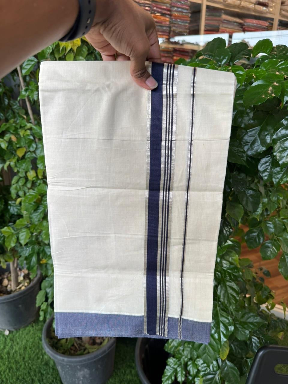 20% Discount! KaithariKada Balaramapuram 100% Cotton Off white Double Mundu/Dhoti - (100x80)S - 1.5 inch Dark Blue & Silver Kasav Striped Kara - 4mtr (8.5muzham) - 71 KK5255 VAS
