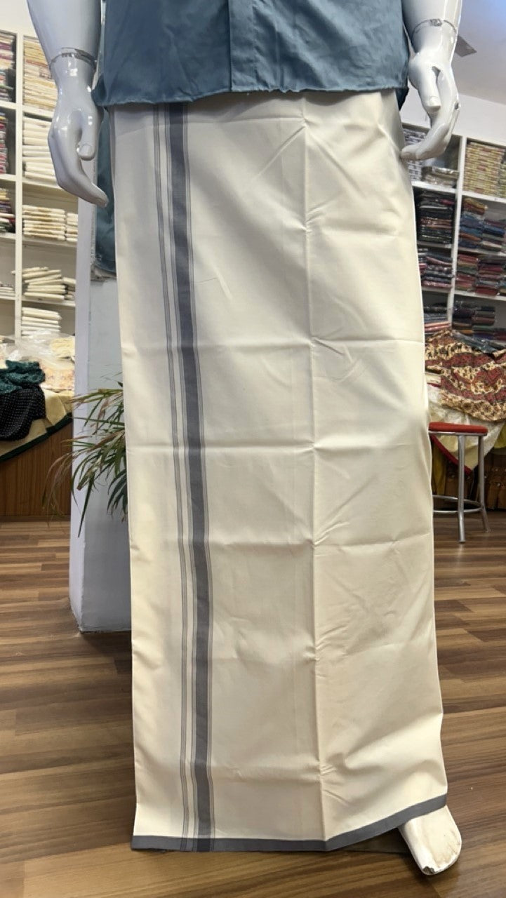 19% DISCOUNT ! KaithariKada Balaramapuram 100% COTTON SINGLE OFF WHITE - (Unbleached) Mundu/Dhoti-Twisted 100s Thread- 1.5 inch GREY Striped Kara (2 meter / 4 muzham)- 4KK5055ASH